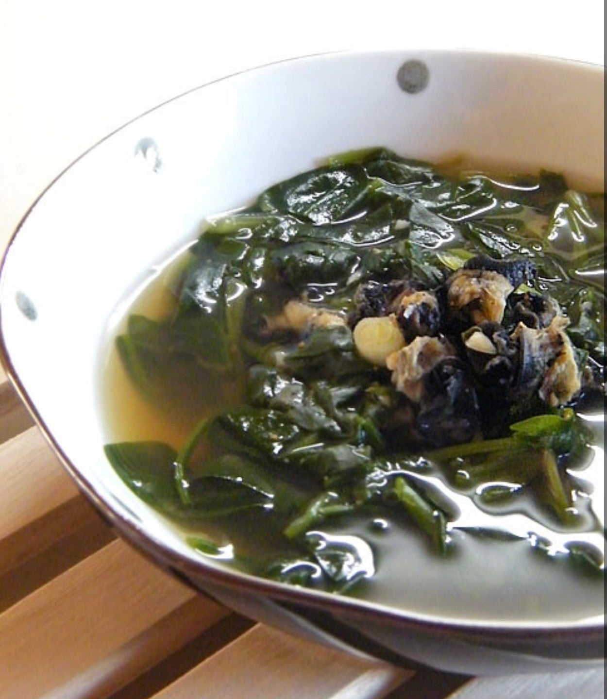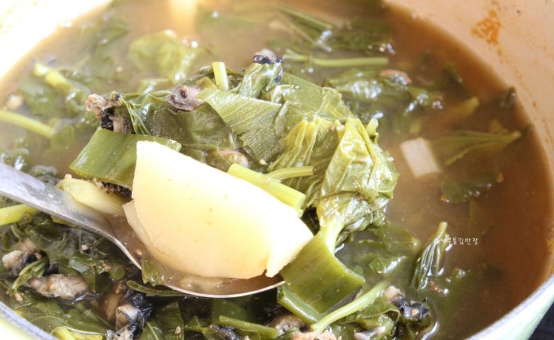 Traditional Korean soybean paste soup with mallow greens and freshwater snails.