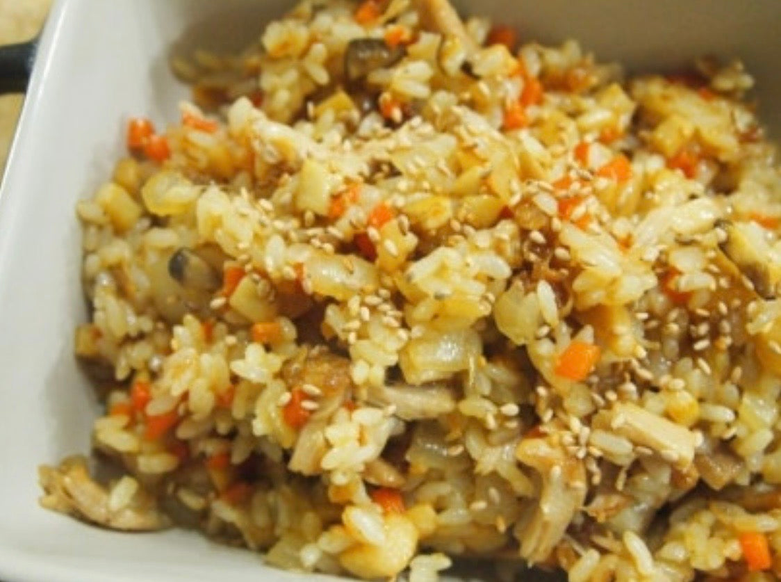 Stir-fried rice with tender chicken and fresh vegetables, seasoned with savory house sauce.