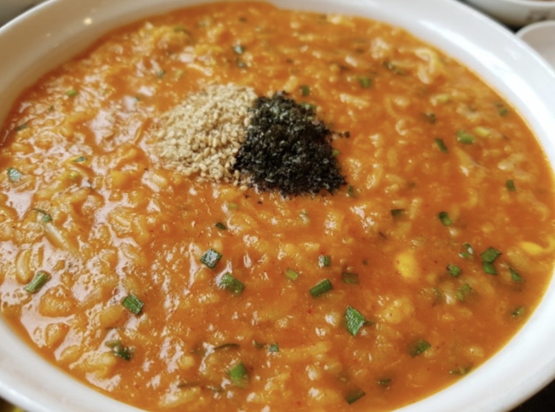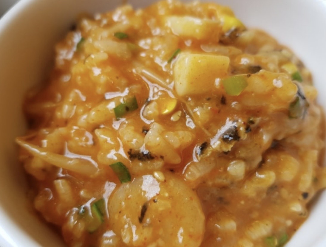 Seafood rice porridge cooked in a rich and spicy jjambbong broth.